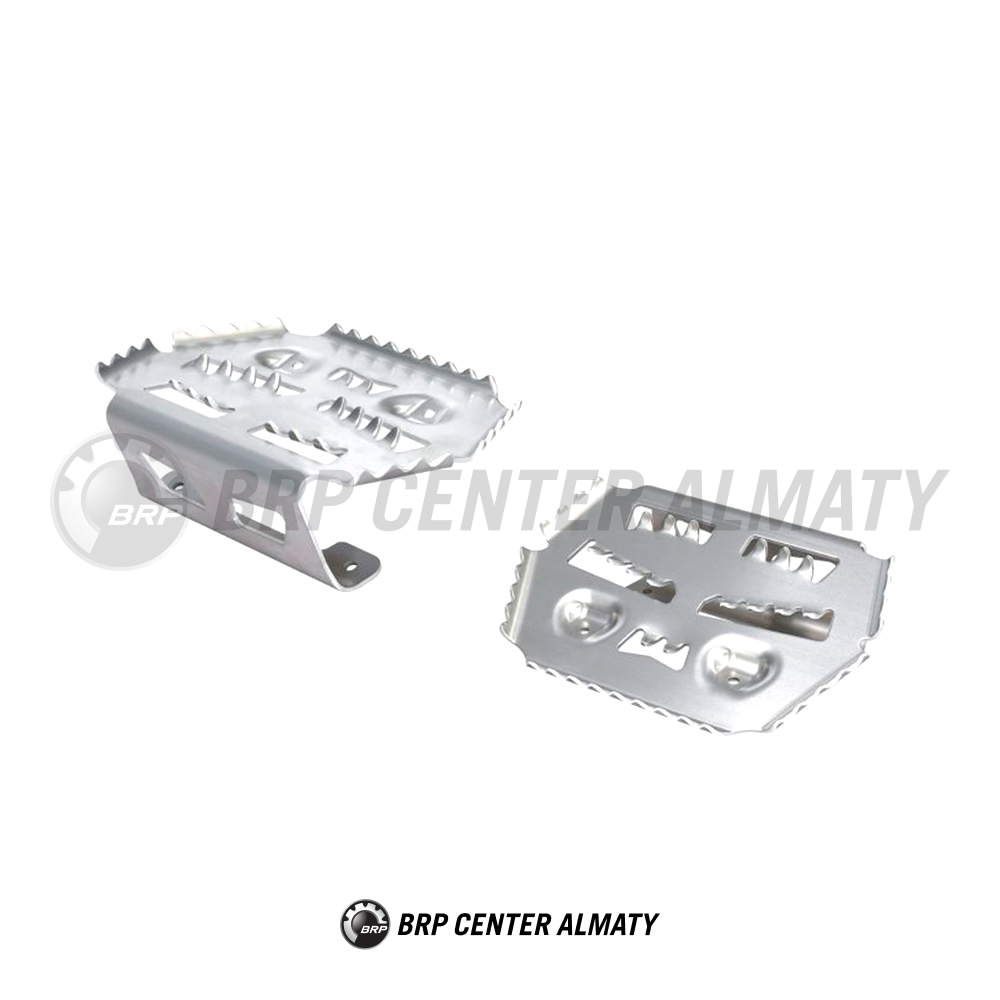Комплект подножек Can-Am 715004759. Изготовлены из алюминия. Устанавливаются вместо штатных подножек. Конструкция с большими выпускными отверстиями препятствует налипанию снега и грязи на подножках. Дизайн со специальными зубчиками усиливает сцепление. Несовместимы с защитой бортов квадроцикла. В комплект поставки входят два изделия. Подходит для G2 2015 года и новее, G2L.
